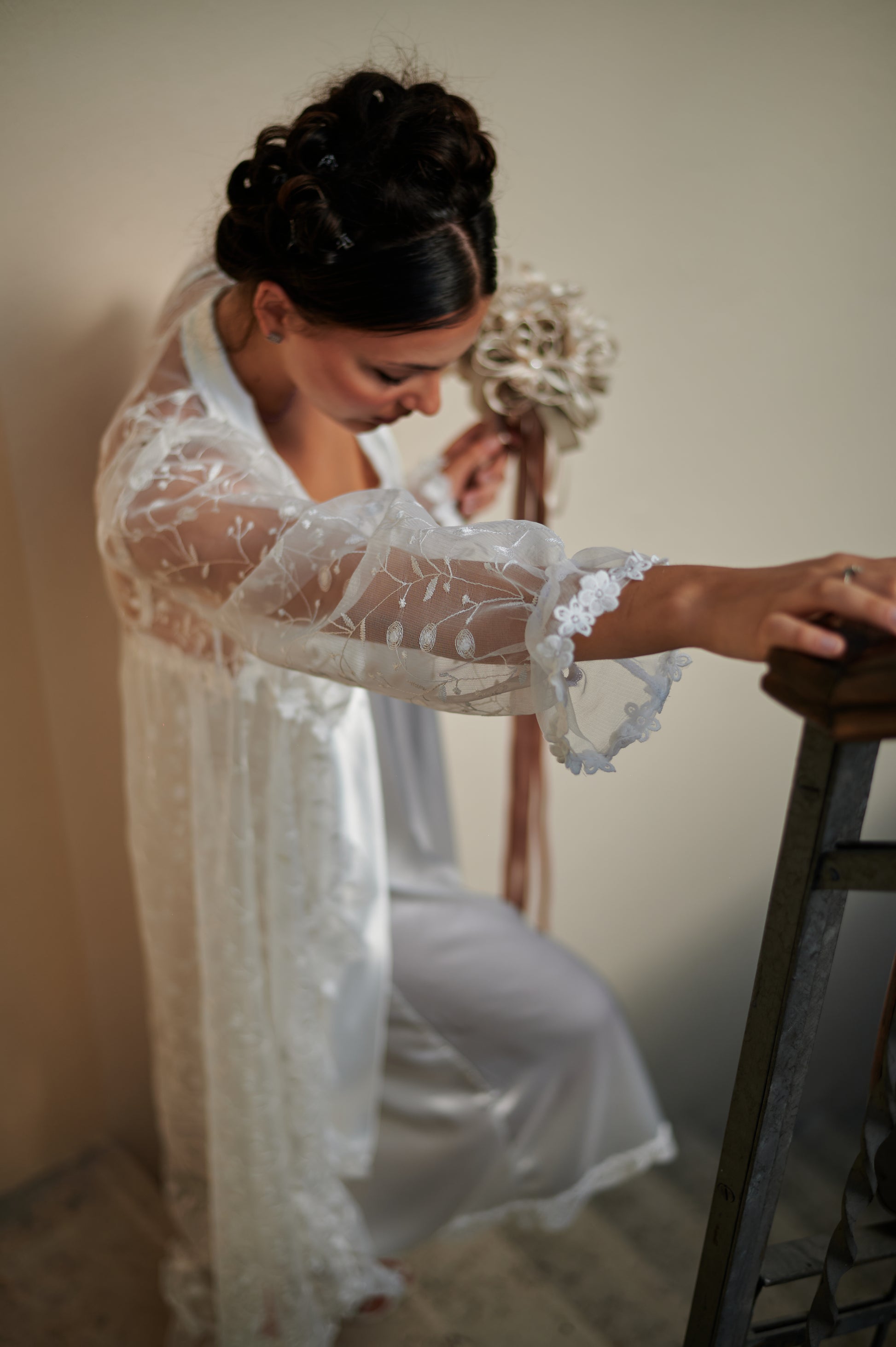 Nuestra Bata Jazmin, hecha a mano con amor, es larga, cómoda y elegante, con tulle bordado y aplicaciones florales cuidadosamente colocadas.
